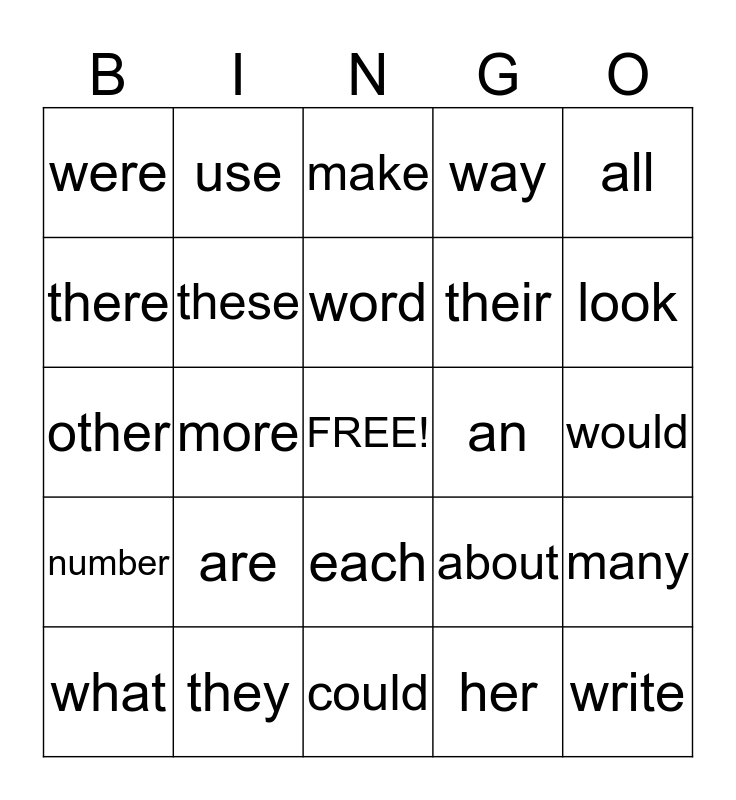 This bingo card has a free space and 24 words: are, they, word, what, all, were, there, use, an, each, their, other, about, many, these, her, would, make, look, more, write, number, way and could.