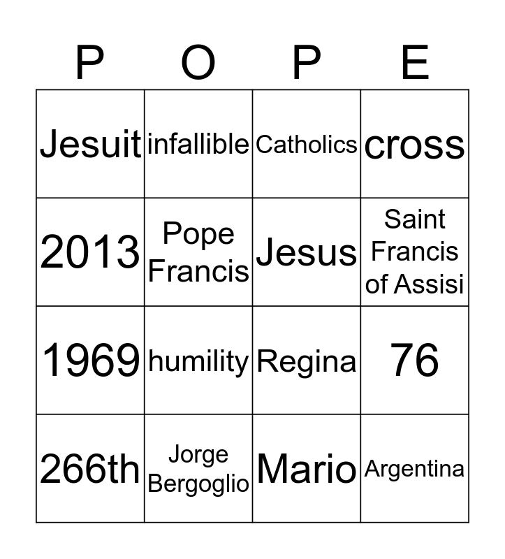 This bingo card has 16 words: Jorge Bergoglio, 76, Catholics, Jesuit, 1969, infallible, Regina, Mario, 2013, Pope Francis, 266th, cross, humility, Saint Francis of Assisi, Jesus and Argentina.