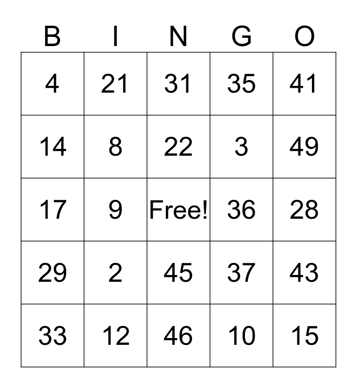 This bingo card has a free space and 24 words: 2, 12, 22, 33, 41, 4, 14, 21, 36, 45, 3, 17, 37, 43, 8, 10, 28, 31, 49, 9, 15, 29, 35 and 46.