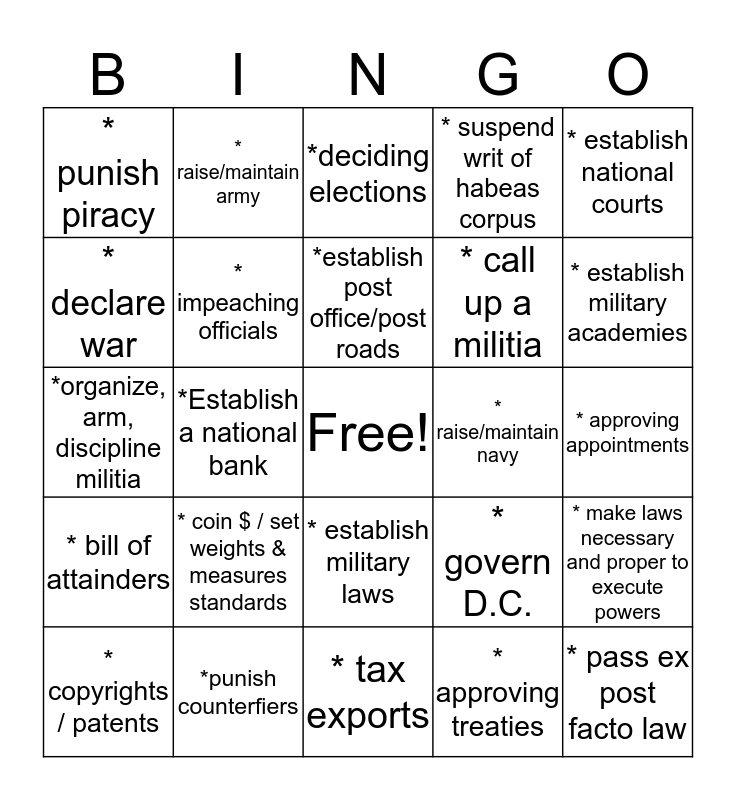 This bingo card has a free space and 24 words: * coin $ / set weights & measures standards, *punish counterfiers, *establish post office/post roads, * copyrights / patents, * establish national courts, * punish piracy, * declare war, * raise/maintain army, * raise/maintain navy, * establish military laws, * call up a militia, *organize, arm, discipline militia, * govern D.C., * make laws necessary and proper to execute powers, * impeaching officials, * approving treaties, * approving appointments, *deciding elections, * establish military academies, *Establish a national bank, * pass ex post facto law, * bill of attainders, * suspend writ of habeas corpus and * tax exports.