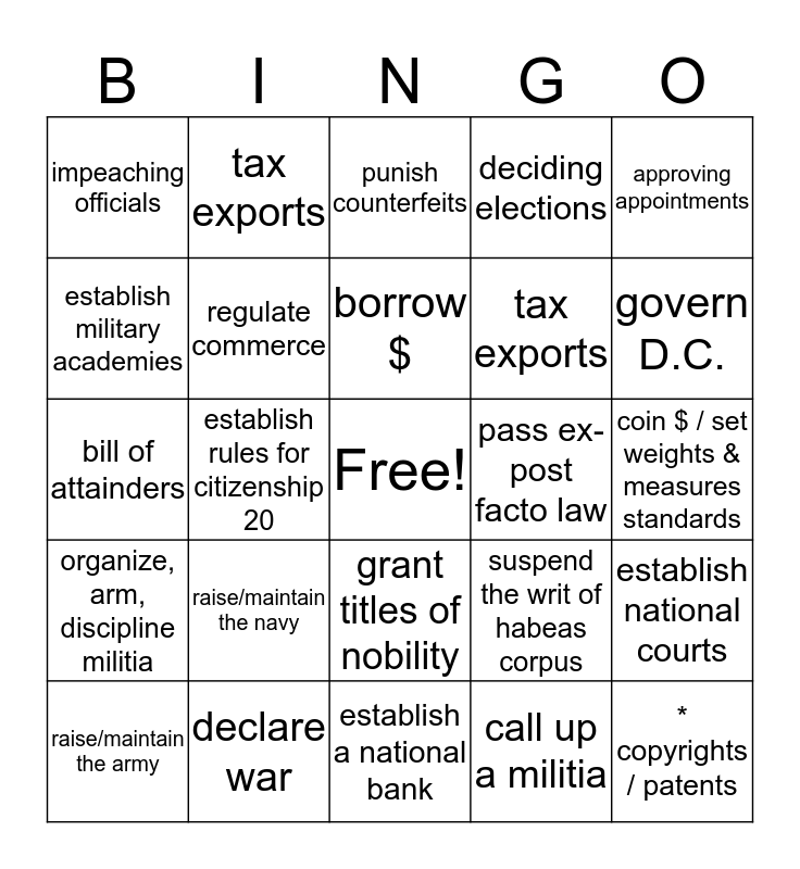 This bingo card has a free space and 24 words: raise/maintain the navy, declare war, borrow $, raise/maintain the army, approving appointments, impeaching officials, establish military academies, tax exports, pass ex-post facto law, grant titles of nobility, tax exports, bill of attainders, suspend the writ of habeas corpus, establish national courts, regulate commerce, call up a militia, coin $ / set weights & measures standards, punish counterfeits, govern D.C., establish rules for citizenship 20, * copyrights / patents, organize, arm, discipline militia, deciding elections and establish a national bank.