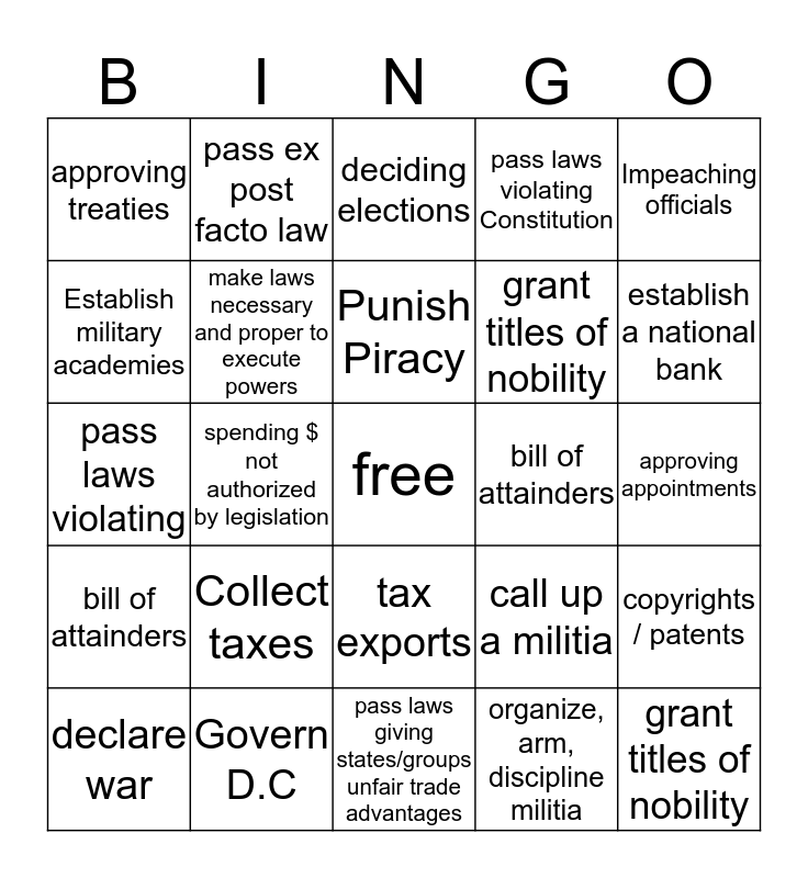 This bingo card has a free space and 24 words: Collect taxes, Govern D.C, Punish Piracy, declare war, Impeaching officials, approving treaties, Establish military academies, pass ex post facto law, bill of attainders, tax exports, grant titles of nobility, pass laws violating, call up a militia, copyrights / patents, make laws necessary and proper to execute powers, organize, arm, discipline militia, approving appointments, deciding elections, establish a national bank, spending $ not authorized by legislation, grant titles of nobility, bill of attainders, pass laws violating Constitution and pass laws giving states/groups unfair trade advantages.