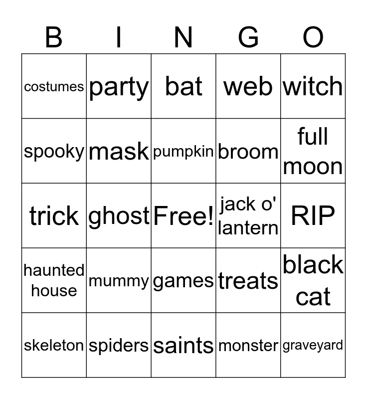 This bingo card has a free space and 24 words: mummy, spiders, pumpkin, skeleton, witch, costumes, spooky, party, jack o' lantern, games, broom, trick, treats, black cat, mask, monster, RIP, bat, full moon, ghost, graveyard, haunted house, web and saints.