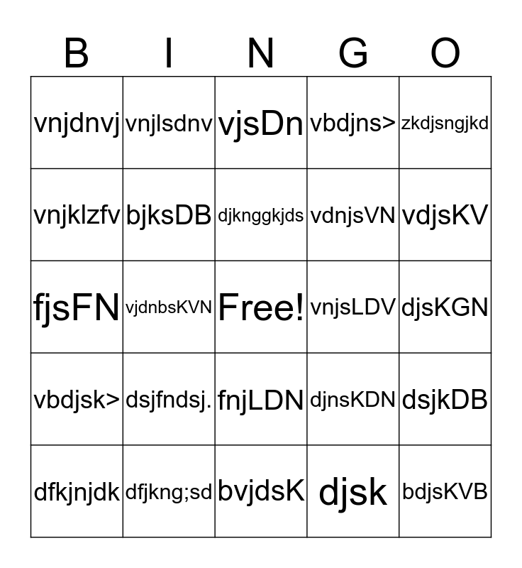 This bingo card has a free space and 24 words: dsjfndsj., dfjkng;sd, djknggkjds, dfkjnjdk, zkdjsngjkd, vnjdnvj, vnjklzfv, vnjlsdnv, vnjsLDV, fnjLDN, vdnjsVN, fjsFN, djnsKDN, dsjkDB, bjksDB, djsk, djsKGN, vjsDn, vdjsKV, vjdnbsKVN, bdjsKVB, vbdjsk>, vbdjns> and bvjdsK.