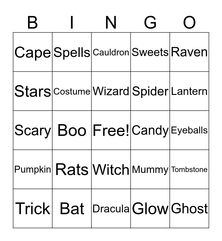 This bingo card has a free space and 30 words: Bat, Cat, Boo, Bones, Cape, Cauldron, Costume, Witch, Candy, Dracula, Eyeballs, Ghost, Glow, Treats, Lantern, Magic, Mummy, Pumpkin, Rats, Raven, Scary, Scream, Spells, Spider, Stars, Sweets, Tombstone, Trick, Wizard and Zombie.