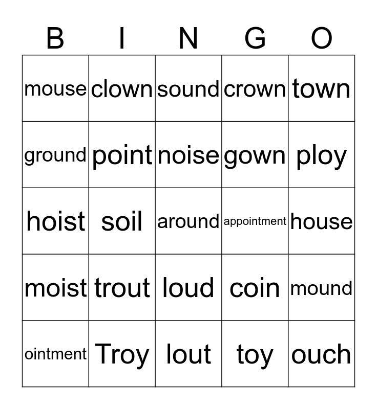 This bingo card has 25 words: trout, lout, noise, ointment, town, mouse, ground, clown, appointment, loud, gown, hoist, coin, mound, point, ouch, house, sound, ploy, soil, around, Troy, moist, crown and toy.