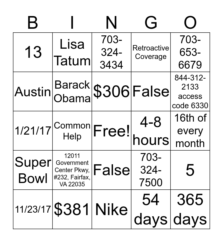 This bingo card has a free space and 24 words: 12011 Government Center Pkwy, #232, Fairfax, VA 22035, $381, $306, 11/23/17, 703-653-6679, 13, Austin, Lisa Tatum, 4-8 hours, False, False, 1/21/17, 703-324-7500, 5, Barack Obama, 54 days, 16th of every month, 703-324-3434, 844-312-2133 access code 6330, Common Help, 365 days, Super Bowl, Retroactive Coverage and Nike.