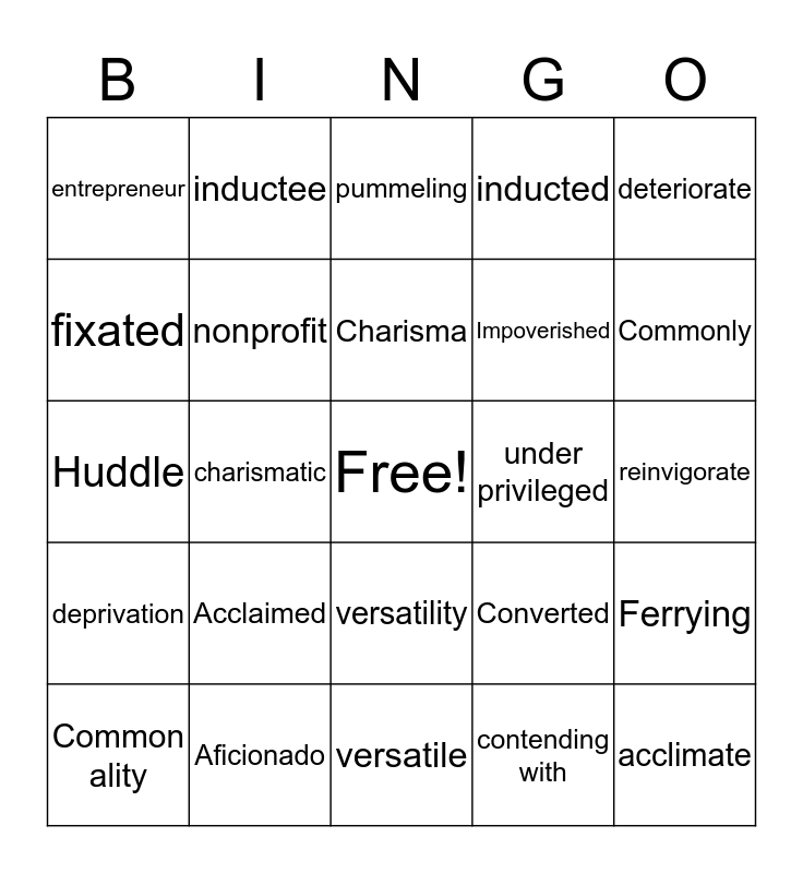 This bingo card has a free space and 24 words: Acclaimed, Aficionado, Charisma, Common ality, deteriorate, entrepreneur, fixated, inductee, under privileged, versatility, Impoverished, Huddle, Converted, Ferrying, nonprofit, contending with, reinvigorate, pummeling, Commonly, charismatic, acclimate, deprivation, inducted and versatile.