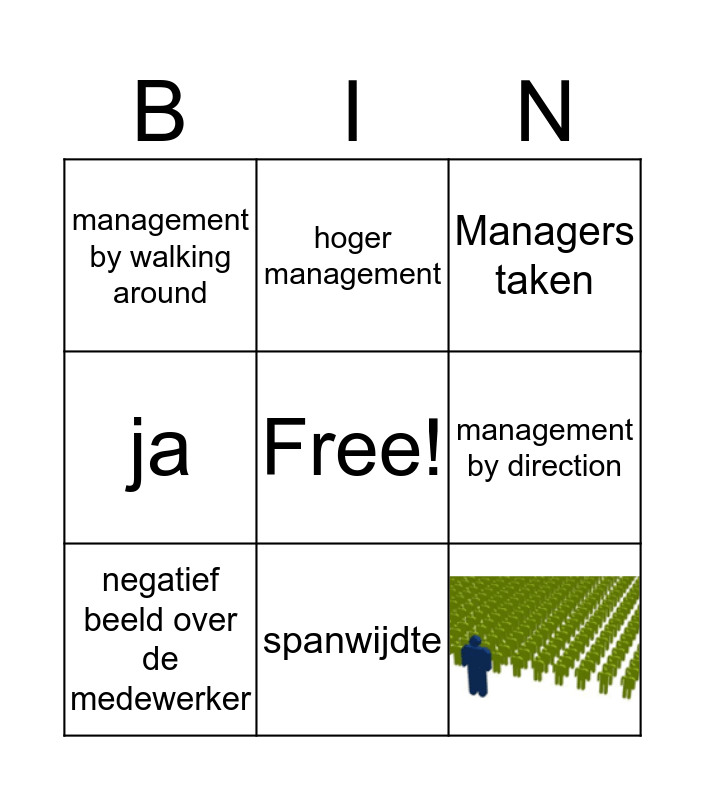 This bingo card has 2 images, a free space and 9 words: spanwijdte, negatief beeld over de medewerker, hoger management, Managers taken, management by direction, nee, ja, management by walking around and HRM.