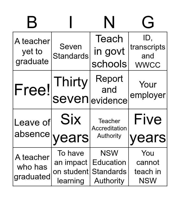 This bingo card has 16 words: To have an impact on student learning, Five years, Teach in govt schools, A teacher yet to graduate, Leave of absence, Seven Standards, Teacher Accreditation Authority, NSW Education Standards Authority, Free!, Thirty seven, A teacher who has graduated, ID, transcripts and WWCC, Six years, Your employer, Report and evidence and You cannot teach in NSW.