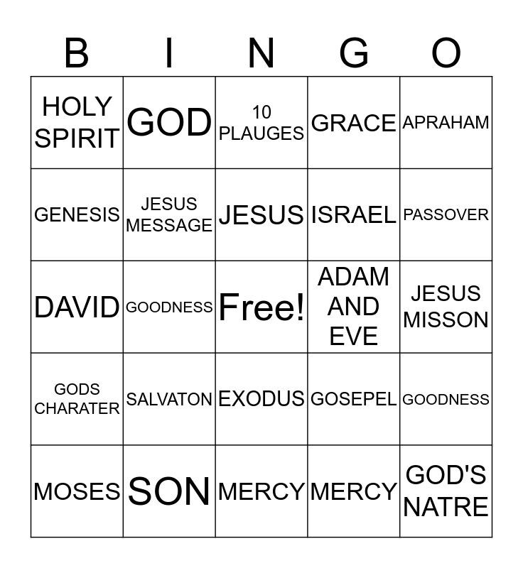 This bingo card has a free space and 24 words: SALVATON, SON, JESUS, MOSES, APRAHAM, HOLY SPIRIT, GENESIS, GOD, ADAM AND EVE, EXODUS, ISRAEL, DAVID, GOSEPEL, GOODNESS, JESUS MESSAGE, MERCY, JESUS MISSON, 10 PLAUGES, PASSOVER, GOODNESS, GOD'S NATRE, GODS CHARATER, GRACE and MERCY.