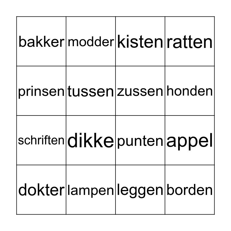 This bingo card has 16 words: lampen, appel, kisten, bakker, schriften, modder, punten, leggen, prinsen, tussen, dokter, ratten, dikke, honden, zussen and borden.