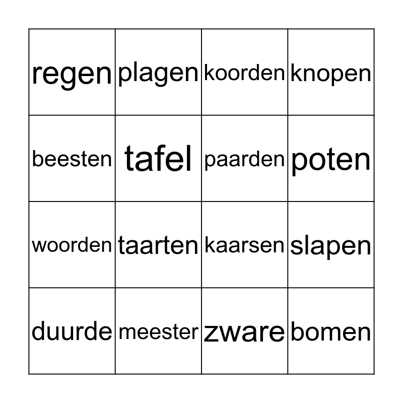 This bingo card has 16 words: meester, slapen, koorden, regen, woorden, plagen, kaarsen, zware, beesten, tafel, duurde, knopen, taarten, poten, paarden and bomen.