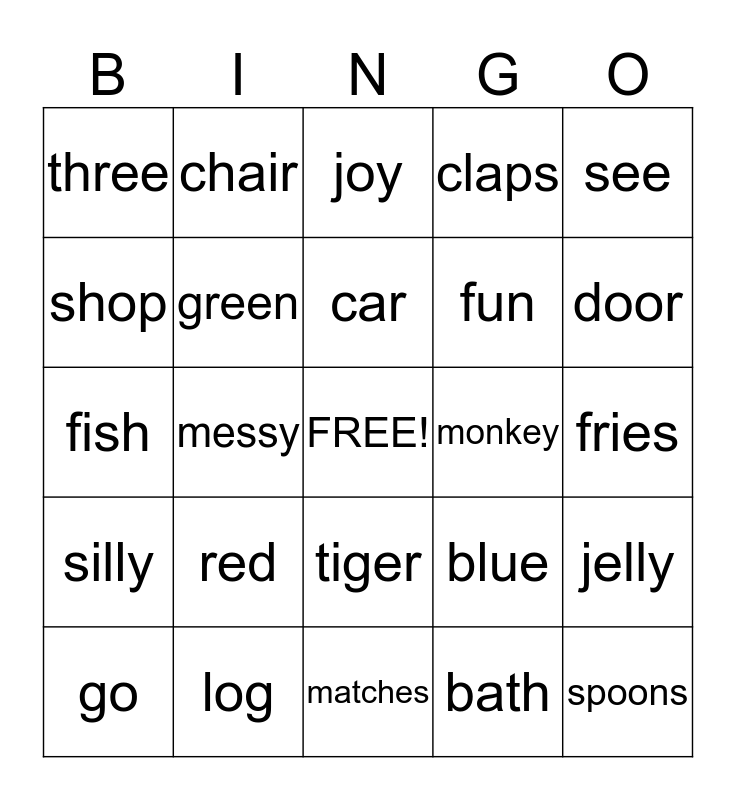 This bingo card has a free space and 24 words: red, log, car, go, see, three, shop, chair, monkey, tiger, fun, fish, blue, jelly, green, bath, fries, joy, door, messy, spoons, silly, claps and matches.