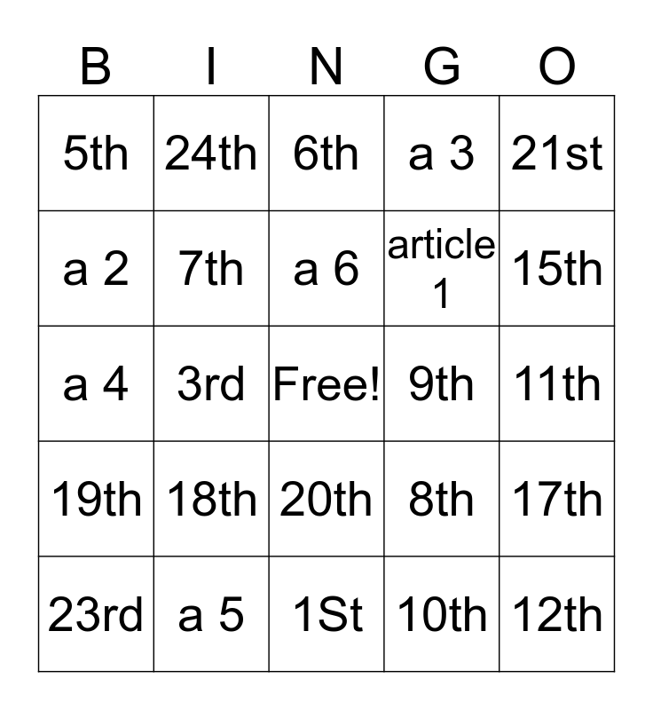 This bingo card has a free space and 31 words: 1St, 2nd, 3rd, 4th, 5th, 6th, 7th, 8th, 9th, 10th, 11th, 12th, 13th, 14th, 15th, 16th, 17th, 18th, 19th, 20th, 21st, 22nd, 23rd, 24th, article 1, a 2, a 3, a 4, a 5, a 6 and a 7.