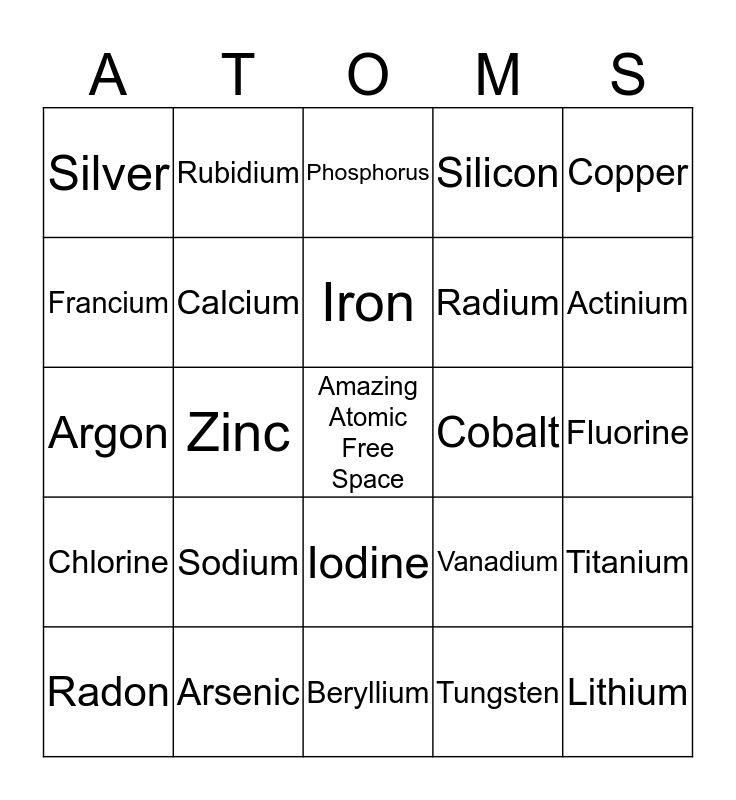 This bingo card has a free space and 52 words: Hydrogen, Lithium, Helium, Beryllium, Sodium, Potassium, Rubidium, Caesium, Francium, Magnesium, Calcium, Strontium, Titanium, Vanadium, Chromium, Manganese, Iron, Cobalt, Nickel, Copper, Zinc, Tungsten, Silver, Radium, Platinum, Gold, Mercury, Lanthanum, Actinium, Boron, Carbon, Silicon, Tin, Lead, Nitrogen, Phosphorus, Arsenic, Bismuth, Oxygen, Sulfur, Selenium, Fluorine, Chlorine, Bromine, Iodine, Helium, Neon, Argon, Krypton, Xenon, Radon and Barium.