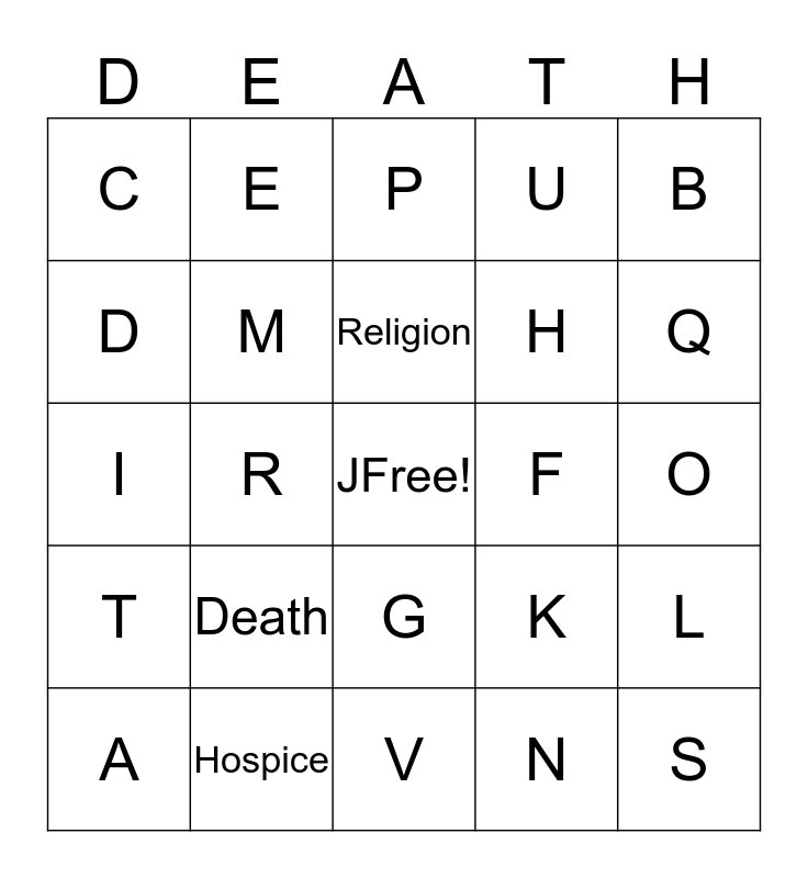 This bingo card has a free space and 24 words: Death, Hospice, Religion, A, B, C, D, E, F, G, H, I, K, L, M, N, O, P, Q, R, S, T, U and V.