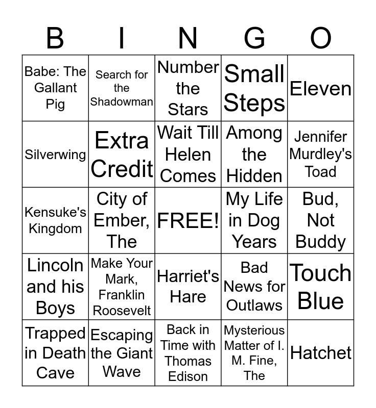 This bingo card has a free space and 30 words: Escaping the Giant Wave, Captain Nobody, City of Ember, The, Masterpiece, Babe: The Gallant Pig, Number the Stars, Extra Credit, Harriet's Hare, My Life in Dog Years, Back in Time with Thomas Edison, Bud, Not Buddy, Hatchet, Mysterious Matter of I. M. Fine, The, Invention of Hugo Cabre, Jennifer Murdley's Toad, Castle in the Attic, The, Bad News for Outlaws, Lincoln and his Boys, Make Your Mark, Franklin Roosevelt, Eleven, Kensuke's Kingdom, Free Baseball, Search for the Shadowman, Among the Hidden, Silverwing, Small Steps, Touch Blue, Trapped in Death Cave, Wait Till Helen Comes and Wonder.