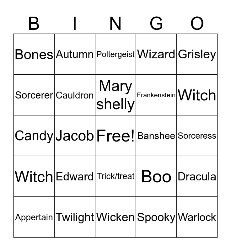 This bingo card has a free space and 24 words: Edward, Twilight, Mary shelly, Appertain, Grisley, Bones, Sorcerer, Autumn, Banshee, Trick/treat, Frankenstein, Candy, Boo, Dracula, Cauldron, Spooky, Sorceress, Poltergeist, Witch, Jacob, Warlock, Witch, Wizard and Wicken.