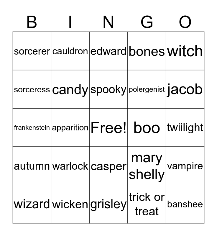 This bingo card has a free space and 24 words: warlock, wicken, spooky, wizard, witch, sorcerer, sorceress, cauldron, boo, casper, polergenist, frankenstein, mary shelly, vampire, candy, trick or treat, twiilight, edward, jacob, apparition, banshee, autumn, bones and grisley.