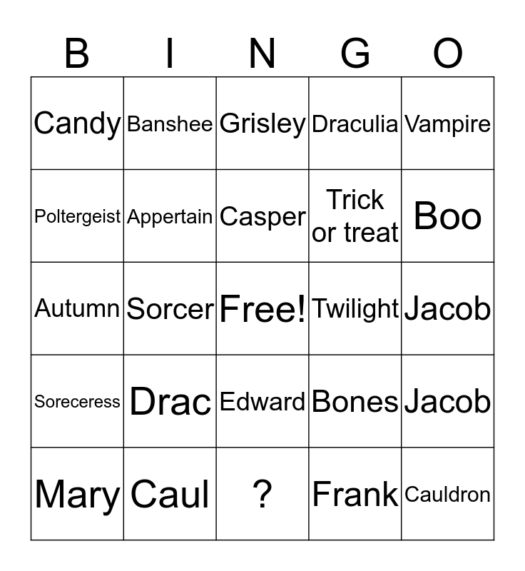 This bingo card has a free space and 24 words: Drac, Caul, Casper, Mary, Vampire, Candy, Poltergeist, Banshee, Twilight, Edward, Trick or treat, Autumn, Bones, Jacob, Appertain, Frank, Jacob, Grisley, Boo, Sorcer, Cauldron, Soreceress, Draculia and ?.