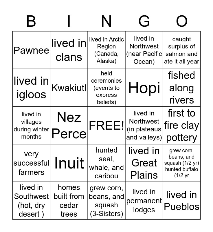 This bingo card has a free space and 24 words: Inuit, homes built from cedar trees, held ceremonies (events to express beliefs), lived in Southwest (hot, dry desert ), caught surplus of salmon and ate it all year, Pawnee, lived in igloos, lived in clans, lived in Northwest (in plateaus and valleys), hunted seal, whale, and caribou, Hopi, lived in villages during winter months, lived in Great Plains, grew corn, beans, and squash (1/2 yr) hunted buffalo (1/2 yr, Kwakiutl, lived in permanent lodges, first to fire clay pottery, lived in Arctic Region (Canada, Alaska), fished along rivers, Nez Perce, lived in Pueblos, very successful farmers, lived in Northwest (near Pacific Ocean) and grew corn, beans, and squash (3-Sisters).