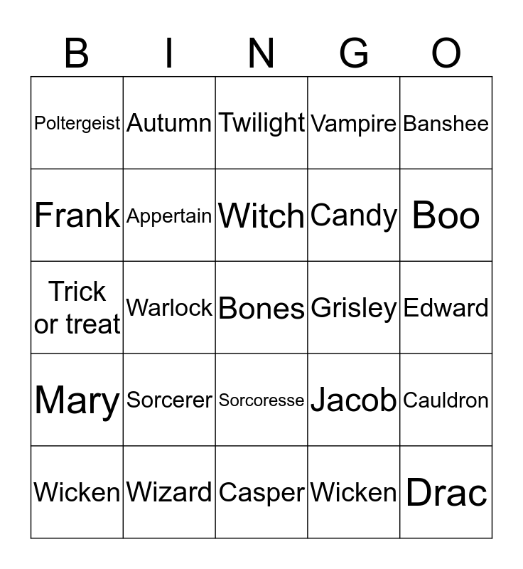 This bingo card has a free space and 24 words: Sorcerer, Wizard, Witch, Wicken, Banshee, Poltergeist, Frank, Autumn, Grisley, Sorcoresse, Candy, Trick or treat, Jacob, Cauldron, Appertain, Wicken, Edward, Twilight, Boo, Warlock, Drac, Mary, Vampire and Casper.