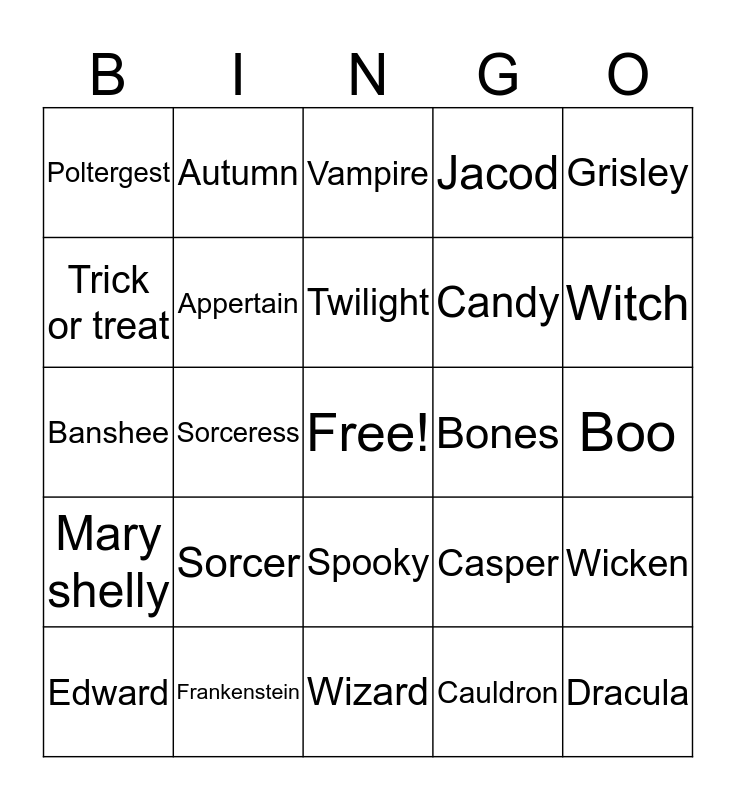 This bingo card has a free space and 24 words: Sorcer, Frankenstein, Twilight, Edward, Grisley, Poltergest, Trick or treat, Autumn, Bones, Spooky, Candy, Banshee, Casper, Wicken, Appertain, Cauldron, Boo, Vampire, Witch, Sorceress, Dracula, Mary shelly, Jacod and Wizard.