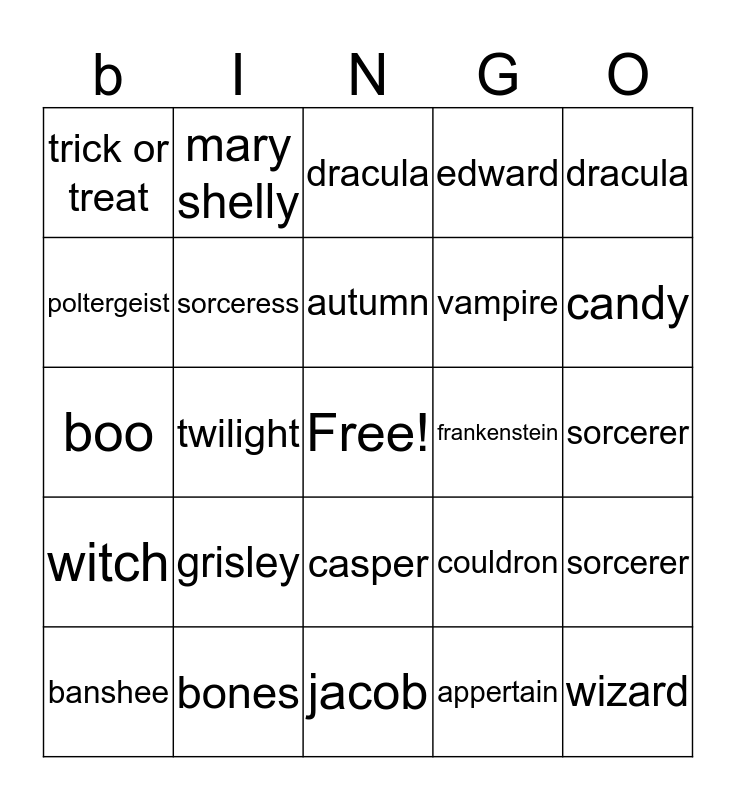 This bingo card has a free space and 24 words: grisley, bones, autumn, banshee, dracula, trick or treat, poltergeist, mary shelly, frankenstein, casper, vampire, boo, couldron, sorcerer, sorceress, appertain, sorcerer, dracula, candy, twilight, wizard, witch, edward and jacob.