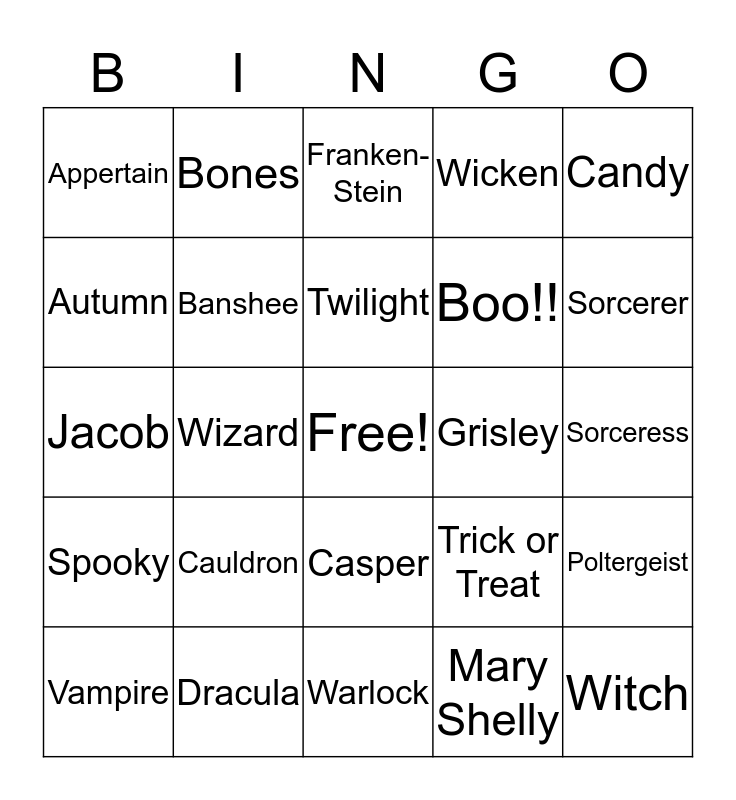 This bingo card has a free space and 24 words: Cauldron, Dracula, Twilight, Vampire, Candy, Appertain, Autumn, Bones, Grisley, Casper, Boo!!, Jacob, Trick or Treat, Poltergeist, Banshee, Mary Shelly, Sorceress, Franken- Stein, Sorcerer, Wizard, Witch, Spooky, Wicken and Warlock.