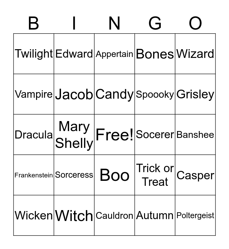 This bingo card has a free space and 24 words: Sorceress, Witch, Candy, Wicken, Wizard, Twilight, Vampire, Edward, Socerer, Boo, Spoooky, Dracula, Trick or Treat, Casper, Jacob, Autumn, Banshee, Appertain, Grisley, Mary Shelly, Poltergeist, Frankenstein, Bones and Cauldron.