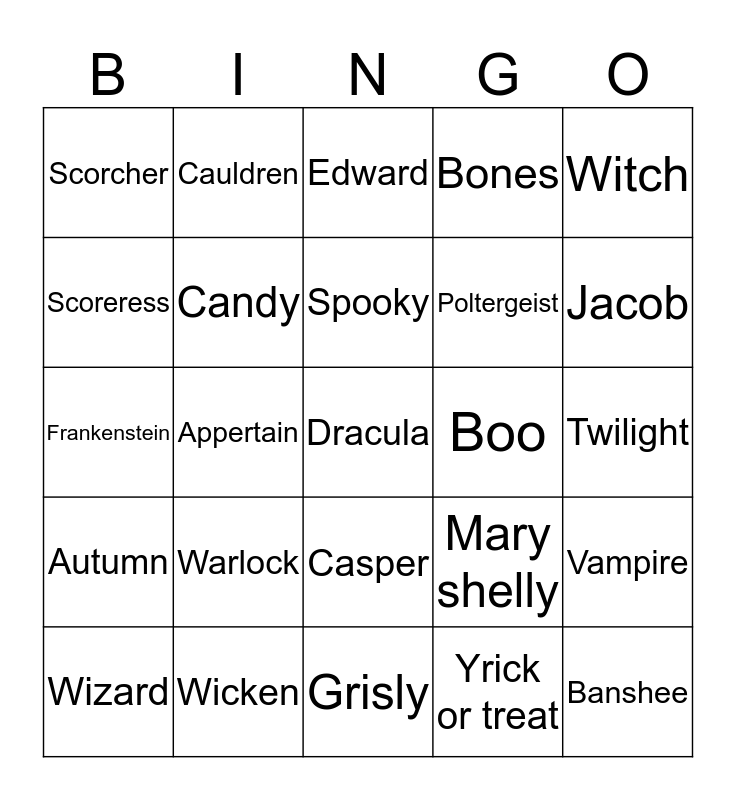 This bingo card has a free space and 24 words: Warlock, Wicken, Spooky, Wizard, Witch, Scorcher, Scoreress, Cauldren, Boo, Casper, Poltergeist, Frankenstein, Mary shelly, Vampire, Candy, Yrick or treat, Twilight, Edward, Jacob, Appertain, Banshee, Autumn, Bones and Grisly.