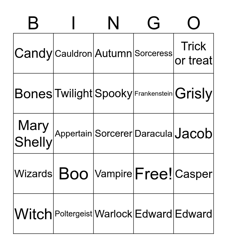 This bingo card has 25 words: Boo, Warlock, Spooky, Witch, Trick or treat, Candy, Bones, Cauldron, Daracula, Vampire, Frankenstein, Mary Shelly, Free!, Casper, Twilight, Edward, Jacob, Autumn, Grisly, Appertain, Sorcerer, Poltergeist, Wizards, Sorceress and Edward.