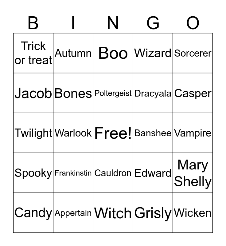 This bingo card has a free space and 24 words: Frankinstin, Appertain, Poltergeist, Candy, Sorcerer, Trick or treat, Jacob, Autumn, Banshee, Cauldron, Dracyala, Twilight, Edward, Mary Shelly, Bones, Grisly, Vampire, Boo, Casper, Warlook, Wicken, Spooky, Wizard and Witch.