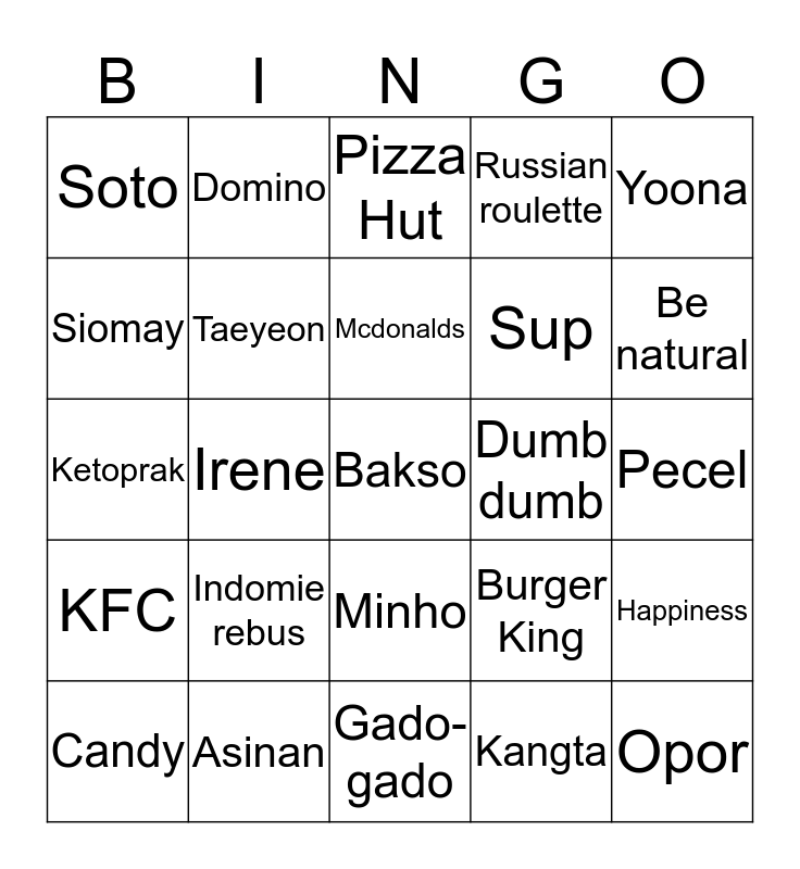 This bingo card has 25 words: Indomie rebus, Gado-gado, Mcdonalds, Candy, Yoona, Soto, Siomay, Domino, Dumb dumb, Minho, Sup, Ketoprak, Burger King, Happiness, Taeyeon, Opor, Pecel, Pizza Hut, Be natural, Irene, Bakso, Asinan, KFC, Russian roulette and Kangta.
