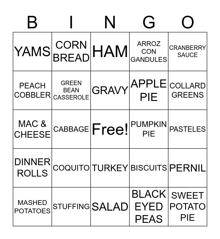 This bingo card has a free space and 24 words: COQUITO, STUFFING, GRAVY, MASHED POTATOES, CRANBERRY SAUCE, YAMS, PEACH COBBLER, CORN BREAD, PUMPKIN PIE, TURKEY, APPLE PIE, MAC & CHEESE, BISCUITS, PERNIL, GREEN BEAN CASSEROLE, BLACK EYED PEAS, PASTELES, HAM, COLLARD GREENS, CABBAGE, SWEET POTATO PIE, DINNER ROLLS, ARROZ CON GANDULES and SALAD.