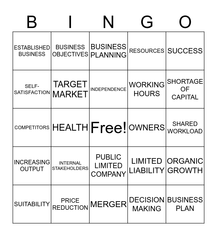 This bingo card has a free space and 75 words: BUSINESS ENTERPRISE, ENTREPRENEURSHIP, BUSINESS PLANNING, BUSINESS OWNERSHIP, AIMS AND OBJECTIVES, GROWTH, ENTREPRENEURIAL CHARACTERISTICS, CREATIVITY, RISK TAKING, DETERMINATION, CONFIDENCE, FINANCIAL, INDEPENDENCE, SELF-SATISFACTION, CHANGING CUSTOMER HABITS, HEALTH, STRAINED RELATIONSHIPS, BUSINESS PLAN, REDUCING RISK, SUCCESS, MARKET RESEARCH, COMPETITORS, TARGET MARKET, BUSINESS OBJECTIVES, RESOURCES, FINANCE, RESOURCES, OPERATE, EASY TO SET UP, CONTROL, PROFITS, FINANCIAL INFORMATION, UNLIMITED LIABILITY, LIMITED LIABILITY, SHORTAGE OF CAPITAL, WORKING HOURS, SKILL SHORTAGE, CONTINUITY, SHARED WORKLOAD, DECISION MAKING, SHAREHOLDERS, ADMINISTRATION, DIVIDENDS, TAKEOVER, PUBLISHED ACCOUNTS, SHARE CAPITAL, SUITABILITY, ESTABLISHED BUSINESS, START-UPS, SLEEPING PARTNER, DEED OF PARTNERSHIP, PUBLIC LIMITED COMPANY, PRIVATE LIMITED COMPANY, SOLE TRADER, PARTNERSHIP, CUSTOMER TRUST, MARKET SHARE, PROVIDING A SERVICE, SATASFICING, STAKEHOLDERS, INTERNAL STAKEHOLDERS, EXTERNAL STAKEHOLDERS, SUPPLIERS, GOVERNMENT, CUSTOMERS, OWNERS, LOCAL COMMUNITY, STAKEHOLDER GROUP, BUSINESS GROWTH, ORGANIC GROWTH, INCREASING OUTPUT, PRICE REDUCTION, DEVELOPING NEW PRODUCTS, MERGER and DIVERSIFICATION.