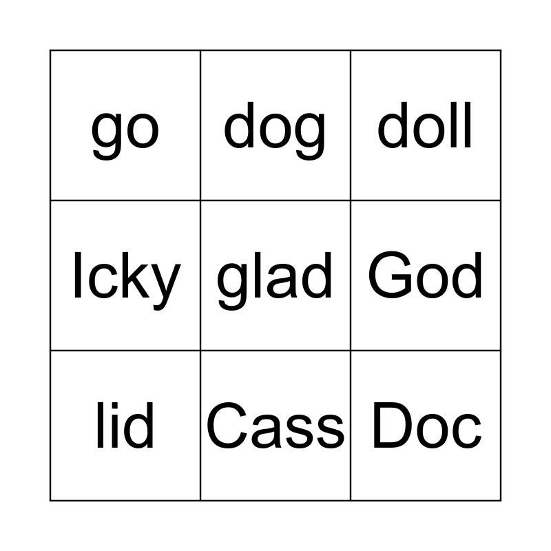 This bingo card has a free space and 8 words: God, doll, dog, lid, go, Doc, Icky and Cass.