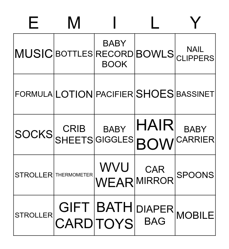 This bingo card has a free space and 24 words: THERMOMETER, GIFT CARD, PACIFIER, STROLLER, NAIL CLIPPERS, MUSIC, FORMULA, BOTTLES, HAIR BOW, WVU WEAR, SHOES, SOCKS, CAR MIRROR, SPOONS, LOTION, DIAPER BAG, BABY CARRIER, BABY RECORD BOOK, BASSINET, CRIB SHEETS, MOBILE, STROLLER, BOWLS and BATH TOYS.