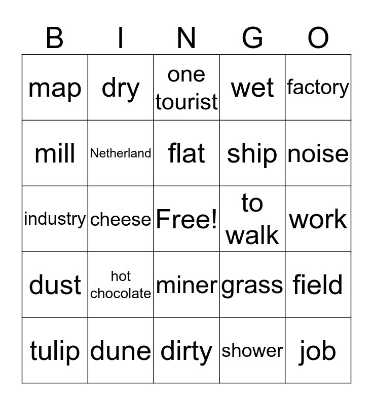 This bingo card has a free space and 29 words: tulip, coast, cheese, dutch, map, one tourist, Netherland, hot chocolate, to walk, dune, work, job, dirty, shower, noise, black, miner, dust, factory, industry, grass, sand, ship, mill, wet, dry, field, flat and shoes.