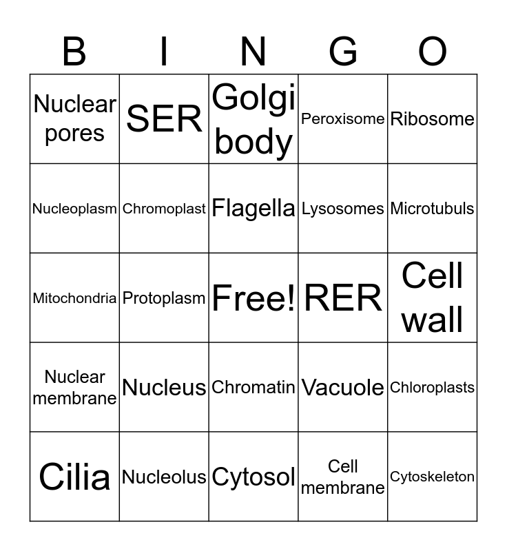 This bingo card has a free space and 24 words: Nucleus, Nucleolus, Flagella, Cilia, Ribosome, Nuclear pores, Nucleoplasm, SER, RER, Chromatin, Lysosomes, Mitochondria, Vacuole, Chloroplasts, Chromoplast, Cell membrane, Cell wall, Golgi body, Microtubuls, Protoplasm, Cytoskeleton, Nuclear membrane, Peroxisome and Cytosol.
