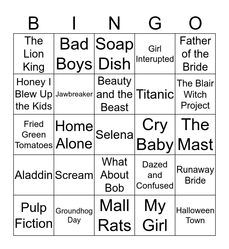 This bingo card has 40 words: Mermaids, Fried Green Tomatoes, Clueless, Jawbreaker, Groundhog Day, What About Bob, Beauty and the Beast, You’ve got mail, Father of the Bride, Aladdin, Home Alone, Girl Interupted, Selena, The Mast, Cry Baby, Scream, I Know What you Did Last Summer, The Lion King, Cruel Intentions, Soap Dish, Runaway Bride, My Girl, Titanic, Honey I Blew Up the Kids, Hocus Pocus, 10 Things I Hate About You, Space Jam, As Good As it Gets, Halloween Town, Step Mom, Varsity Blues, Pulp Fiction, Dumb and Dumber, Dazed and Confused, The Blair Witch Project, Mall Rats, Tommy Boy, The Truman Show, Bad Boys and Bean.