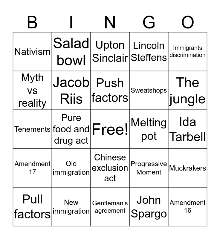 This bingo card has a free space and 24 words: Old immigration, New immigration, Push factors, Pull factors, Immigrants discrimination, Nativism, Myth vs reality, Salad bowl, Melting pot, Chinese exclusion act, Sweatshops, Tenements, Progressive Moment, Muckrakers, Jacob Riis, John Spargo, Ida Tarbell, Upton Sinclair, The jungle, Pure food and drug act, Amendment 16, Amendment 17, Lincoln Steffens and Gentleman’s agreement.