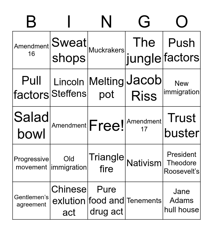 This bingo card has a free space and 24 words: Old immigration, Chinese exlution act, Melting pot, Gentlemen’s agreement, Push factors, Amendment 16, Pull factors, Sweat shops, Amendment 17, Triangle fire, Jacob Riss, Salad bowl, Nativism, President Theodore Roosevelt’s, Lincoln Steffens, Tenements, Trust buster, Muckrakers, New immigration, Amendment, Jane Adams hull house, Progressive movement, The jungle and Pure food and drug act.