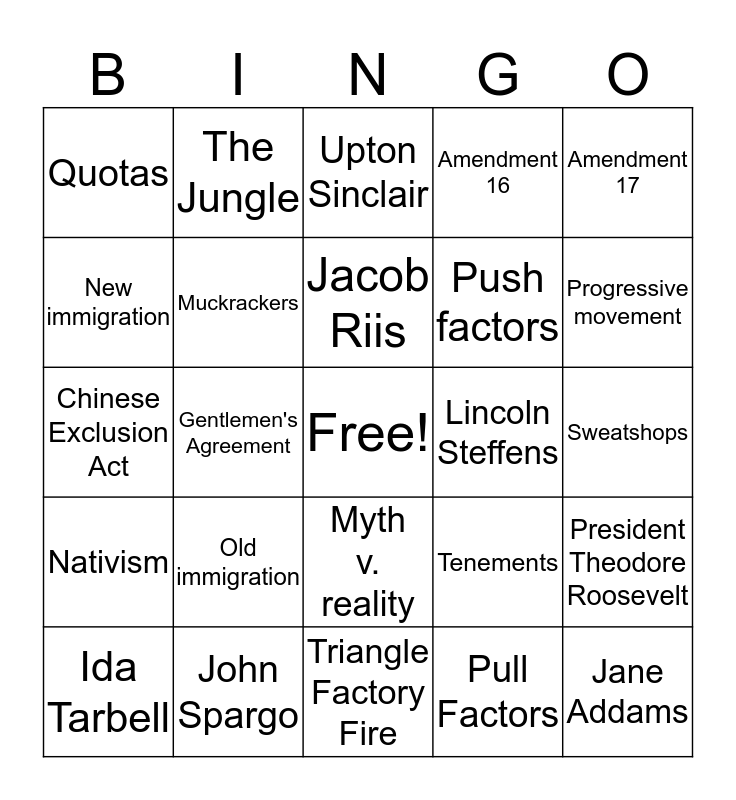 This bingo card has a free space and 24 words: Old immigration, John Spargo, Jacob Riis, Ida Tarbell, Amendment 17, Quotas, New immigration, The Jungle, Lincoln Steffens, Myth v. reality, Push factors, Chinese Exclusion Act, Tenements, President Theodore Roosevelt, Muckrackers, Pull Factors, Sweatshops, Upton Sinclair, Progressive movement, Gentlemen's Agreement, Jane Addams, Nativism, Amendment 16 and Triangle Factory Fire.