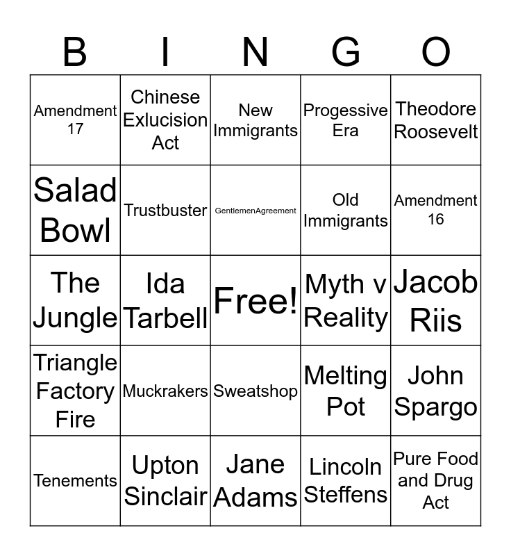 This bingo card has a free space and 24 words: Muckrakers, Upton Sinclair, GentlemenAgreement, Tenements, Theodore Roosevelt, Amendment 17, Salad Bowl, Chinese Exlucision Act, Myth v Reality, Sweatshop, Old Immigrants, The Jungle, Melting Pot, John Spargo, Trustbuster, Lincoln Steffens, Jacob Riis, New Immigrants, Amendment 16, Ida Tarbell, Pure Food and Drug Act, Triangle Factory Fire, Progessive Era and Jane Adams.