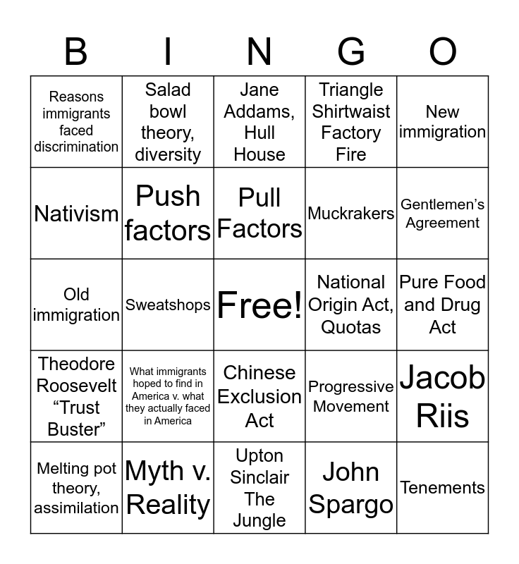 This bingo card has a free space and 24 words: What immigrants hoped to find in America v. what they actually faced in America, Myth v. Reality, Pull Factors, Melting pot theory, assimilation, New immigration, Reasons immigrants faced discrimination, Nativism, Salad bowl theory, diversity, National Origin Act, Quotas, Chinese Exclusion Act, Muckrakers, Old immigration, Progressive Movement, Jacob Riis, Push factors, John Spargo, Pure Food and Drug Act, Jane Addams, Hull House, Gentlemen’s Agreement, Sweatshops, Tenements, Theodore Roosevelt “Trust Buster”, Triangle Shirtwaist Factory Fire and Upton Sinclair The Jungle.