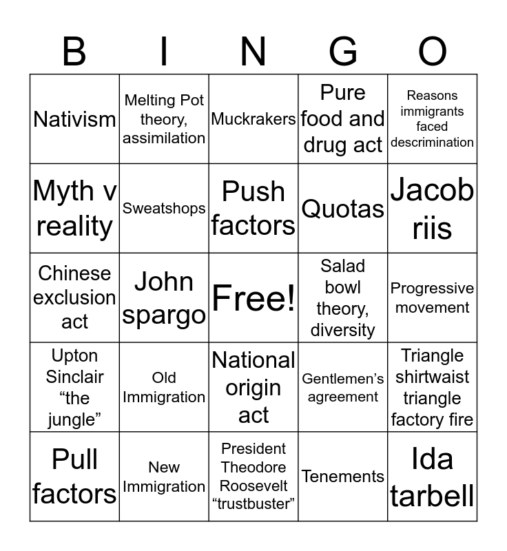 This bingo card has a free space and 24 words: Old Immigration, New Immigration, Push factors, Pull factors, Reasons immigrants faced descrimination, Nativism, Myth v reality, Melting Pot theory, assimilation, Salad bowl theory, diversity, National origin act, Quotas, Chinese exclusion act, Gentlemen’s agreement, Triangle shirtwaist triangle factory fire, Sweatshops, Tenements, Progressive movement, Muckrakers, Jacob riis, John spargo, Ida tarbell, Upton Sinclair “the jungle”, Pure food and drug act and President Theodore Roosevelt “trustbuster”.