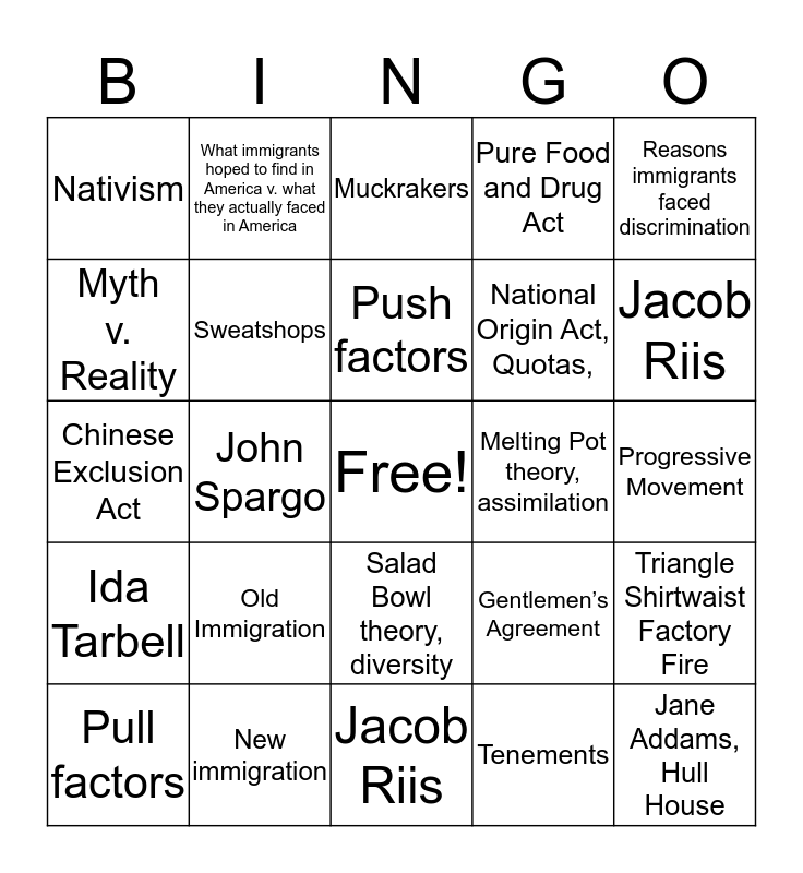 This bingo card has a free space and 24 words: Old Immigration, New immigration, Push factors, Pull factors, Reasons immigrants faced discrimination, Nativism, Myth v. Reality, What immigrants hoped to find in America v. what they actually faced in America, Melting Pot theory, assimilation, Salad Bowl theory, diversity, National Origin Act, Quotas,, Chinese Exclusion Act, Gentlemen’s Agreement, Triangle Shirtwaist Factory Fire, Sweatshops, Tenements, Progressive Movement, Muckrakers, Jacob Riis, John Spargo, Jane Addams, Hull House, Ida Tarbell, Pure Food and Drug Act and Jacob Riis.
