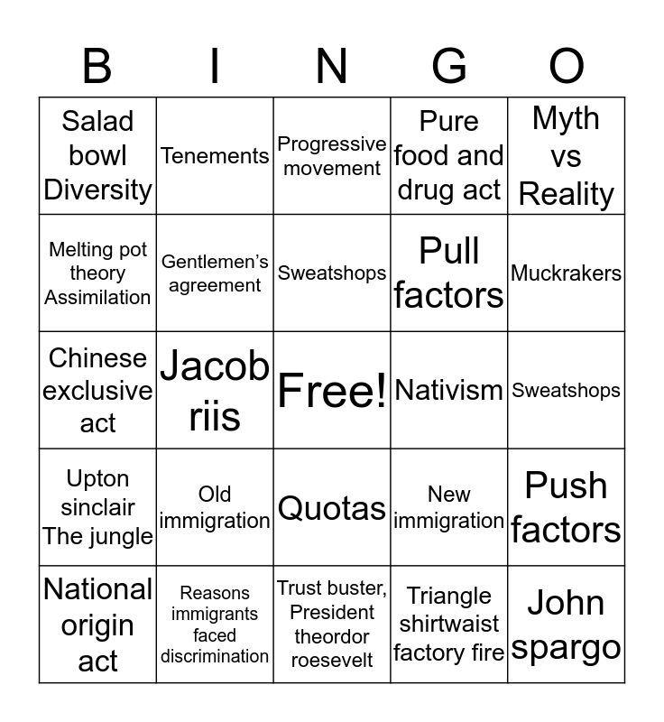 This bingo card has a free space and 24 words: Old immigration, Reasons immigrants faced discrimination, Sweatshops, National origin act, Myth vs Reality, Salad bowl Diversity, Melting pot theory Assimilation, Tenements, Nativism, Quotas, Pull factors, Chinese exclusive act, New immigration, Push factors, Gentlemen’s agreement, Triangle shirtwaist factory fire, Sweatshops, Progressive movement, Muckrakers, Jacob riis, John spargo, Upton sinclair The jungle, Pure food and drug act and Trust buster, President theordor roesevelt.
